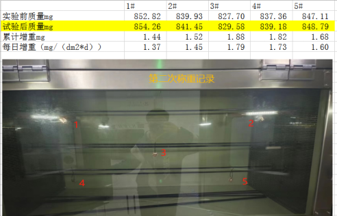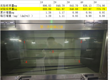 2023年浙江******產(chǎn)品檢驗有限公司第二次采購我司一臺型號為“WHQ-900B”型的混合氣體腐蝕試驗箱,設(shè)備在出廠之前,工作人員已經(jīng)在我內(nèi)部的實驗室進(jìn)行過一次合格的銅片增重測試,之后設(shè)備被運送到客戶指定的場地安裝調(diào)試運行??蛻粼谠O(shè)備運行了一個階段后,自行進(jìn)行一次銅片增重試驗,試驗結(jié)束之后客戶將數(shù)據(jù)發(fā)給我司,以下是客戶和我的聊天記錄和客戶第一次做的數(shù)據(jù):